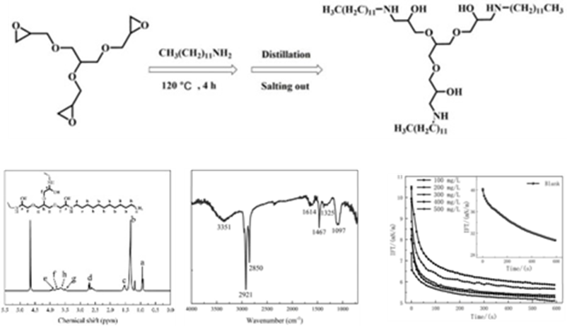 摘要:本发明提供了一种Y型结构破乳剂及其制备方法和应用,所述Y型结构破乳剂的制备方法包括如下步骤:将丙三醇三缩水甘油醚完全溶解于有机溶剂中,然后加入十二胺,在保护气氛下于油浴条件下搅拌反应,得到混合物;将混合物冷却后,在真空条件下蒸馏除去有机溶剂,得到剩余产物;将剩余产物溶解在有机溶剂中,经萃取除去未反应的丙三醇三缩水甘油醚和十二胺;经分离得到有机层,在真空条件下蒸馏除去有机溶剂,即制备得到所述Y型结构破乳剂。所述Y型结构破乳剂在较低的使用量下就能获得较高的破乳效率,且破乳温度更低、破乳时间更短。