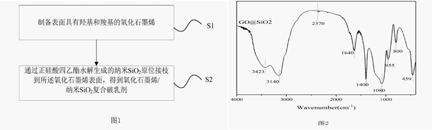 摘要:本发明公开了一种氧化石墨烯/纳米SiO2复合破乳剂的制备方法,所述制备方法包括如下步骤:制备表面具有羟基和羧基的氧化石墨烯;通过正硅酸四乙酯水解生成的纳米SiO2原位接枝到所述氧化石墨烯表面,得到氧化石墨烯/纳米SiO2复合破乳剂。本发明提供的氧化石墨烯/纳米SiO2复合破乳剂的制备方法通过制备具有亲水性含氧官能团的氧化石墨烯,并在该氧化石墨烯上引入纳米SiO2,使制得的破乳剂具有破乳速率快,破乳效果良好,且既能用于W/O乳液,又能用于O/W乳液。本发明还公开了一种采用上述制备方法制得的氧化石墨烯/纳米SiO2复合破乳剂及其应用。
