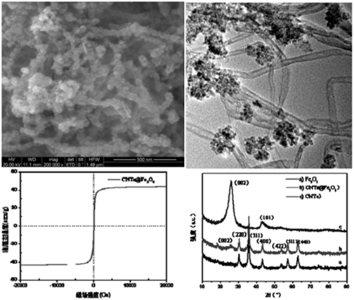 摘要:本发明公开了一种磁性碳纳米管破乳剂的制备方法,包括如下步骤:(1)碳纳米管与混酸进行回流反应,得到氧化改性的碳纳米管;(2)制备Fe3O4前驱体溶液;(3)将所述氧化改性的碳纳米管和所述Fe3O4前驱体溶液混合均匀,并在180~220℃反应制得磁性碳纳米管破乳剂。本发明提供的制备方法先通过混酸对碳纳米管氧化改性,在碳纳米管的缺陷和边缘引入大量羧基和羟基,再利用水热法原位制备Fe3O4纳米粒子修饰经过氧化改性后的碳纳米管,该制备方法简单,易于实施;制得的磁性碳纳米管破乳剂能快速实现含油废水的油水分离,且破乳效果较好。本发明的技术方案还提供了一种磁性碳纳米管破乳剂在含油废水中的应用。