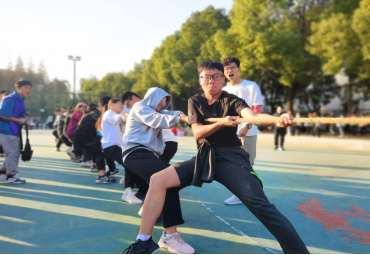 赛场上,同学们英姿飒爽,平日里站在三尺讲台上的老师们也毫不逊色。阳光洒遍操场,同学们热情洋溢。操场上到处是同学和老师运动的身影,在脚踢保龄球的比赛项目中,老师们与员工排成一列轮流参赛,只见刘桂生老师抬脚踢向足球,接连倒下了8个保龄球,顿时引来同学们的欢呼声。旁边的百变接力项目,加油声欢呼声不断,一名男生一个箭步冲过去,起跳,投篮,篮球在空中划过一条优美的弧线后稳稳的落入篮中。活动最后,各班分别进行了拔河比赛,加油呐喊声在操场上此起彼伏,随着拔河比赛的结束,本次运动会的各项比赛也正式结束。