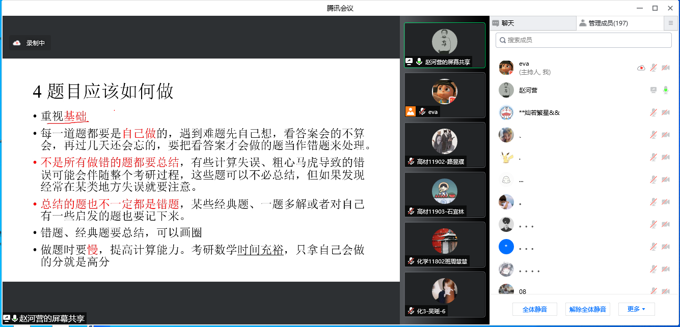 (通讯员:王宇奇)为进一步加深同学们对考研认知,帮助员工掌握科学的备考方法,提升他们的动力和信心,4月11日晚上7点,公司通过腾讯会议举办了bevictor伟德官网18级考研经验分享会。本次会议由辅导员王娜老师主持,石东坡教授参会,18级考研员工代表钟建铭、周慧慧、赵河营、张静、解妍分享考研经验,学院19级、20级同学线上聆听。