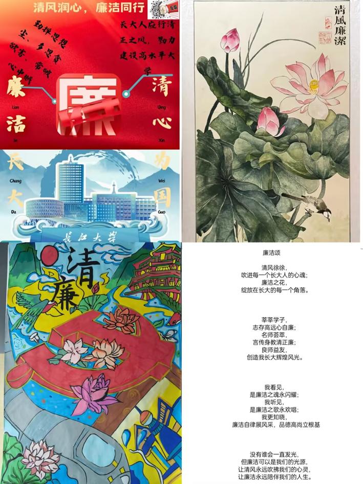 活动期间,开展廉洁主题文化作品设计征集活动。作品内容围绕主题,结合“莲花”、“竹子”“清廉”、国家地标、国家发展的元素、诗歌、社会热点等诠释廉洁自律的精神。文化作品经学院微信公众号展示投票,获得1万多浏览量,转发393人次,点赞232次,在学院和社会层面产生极深远影响,让“廉”字深入每一位师生心中。