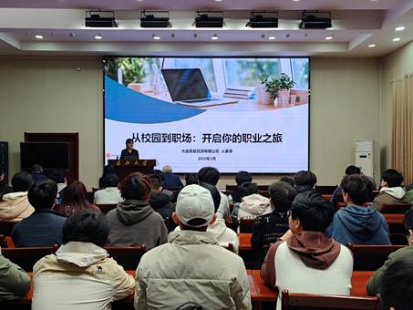 邵巧主任以《从校园到职场:开启你的职业之旅》为题分享经验。她介绍了公司发展优势、历程、人才理念、企业文化,并结合自身经历,通过生动案例深入剖析员工与职场人的差异,深度解读Vuca时代和热门行业发展趋势,说明行业对复合型、创新型人才的需求。最后,邵巧主任分享了通往成功的五个秘籍,并深入讲解职业规划的重要性与实施步骤,鼓励要同学们在行动中成长,在担责中进步。