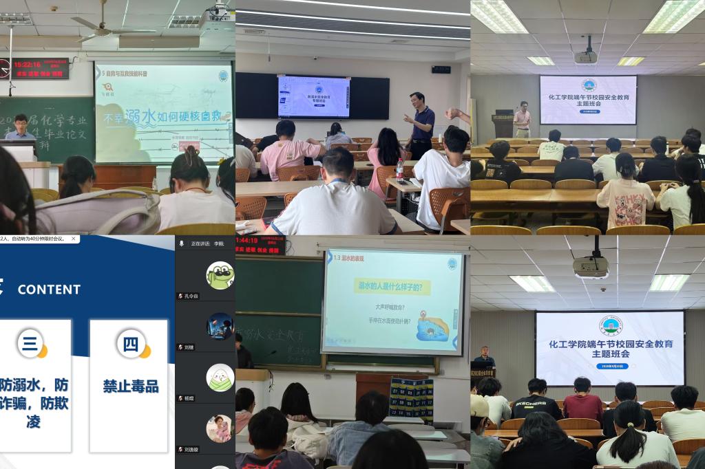 会后各班班主任组织各班分别召开安全班会,讲解端午节出行、防溺、饮食、反诈、宿舍管理、身心健康等注意事项,重点讲解防溺水专题教育。从预防溺水、溺水自救、科学施救三个维度系统讲解相关知识与技能。强调“六不准”原则,特别提醒非专业人员切勿擅自下水施救,应第一时间拨打110、120,并利用竹竿、绳索等工具辅助救援。强调离校员工严格履行请假手续,班委要做好离校同学行程报备工作,定期开展定位打卡掌握员工动态;临近期末和四六级考试,强调同学们要诚信应考等。