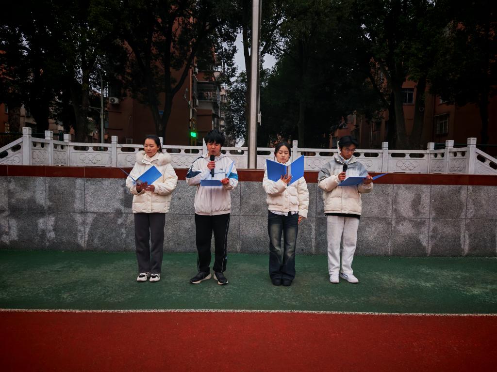 伴随着雄壮激昂的国歌声,鲜艳的五星红旗冉冉升起,全体师生肃立注目,齐声高唱国歌,表达对祖国的无限热爱与崇高敬意。