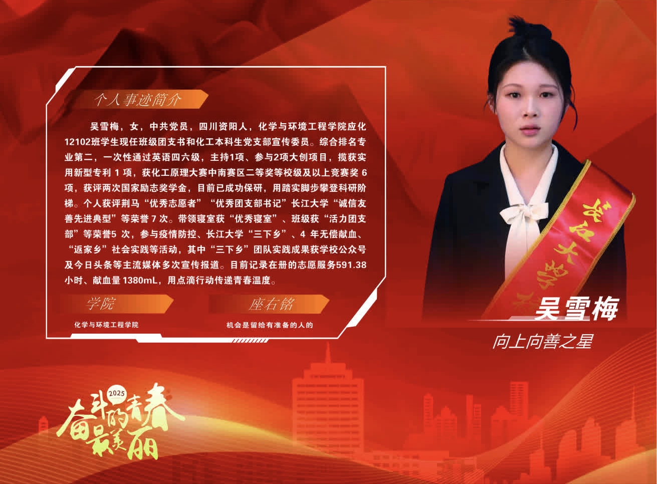个人简介吴雪梅,女,汉族,中共党员,四川资阳人,bevictor伟德官网应化12102班员工。现任班级团支部书记和化工本科生党支部宣传委员。