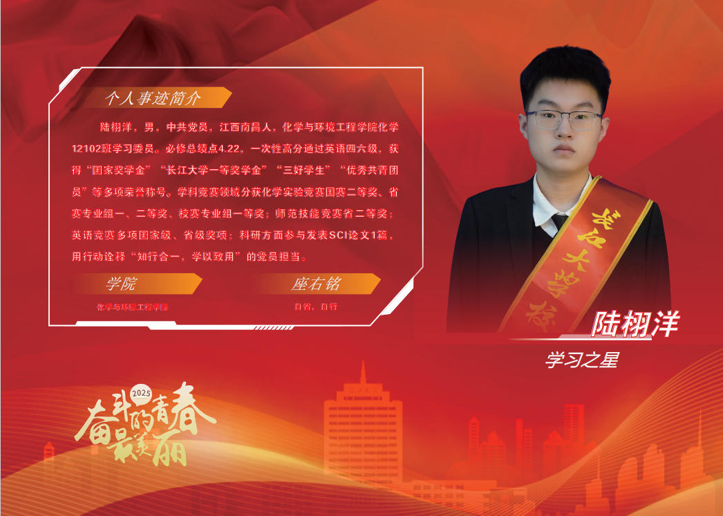 陆栩洋始终践行"学以致用"的理念,将专业知识转化为实践能力:在学业引领方面,他面向22级开展四级、考研专题指导,为24级新生开展成长经验分享会;在学科竞赛中,凭借扎实的专业功底,帮助团队攻克物理化学知识难点,创新整合实验内容,最终带领小组斩获省级奖项;在日常学习中,主动组建班级学习小组,分享学习资料,交流学习心得,促进共同进步。