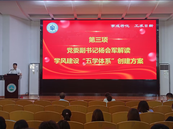 党委副书记杨会军为同学们解读了学院学风建设“五学体系”创建方案,他强调学风建设的重要性,要求同学们树立全面学习、终身学习的观念,明确学习目标,端正学习态度,增强学习动力,取得优异学习成果。希望员工干部发挥带头作用,一带十,互帮互助,形成人人热爱学习、人人督促学习、人人从中受益的生动局面。同时,就本科公司产品审核评估做了再动员,他要求同学们以主人翁的姿态迎接本科公司产品审核评估,积极配合学校做好各项工作。