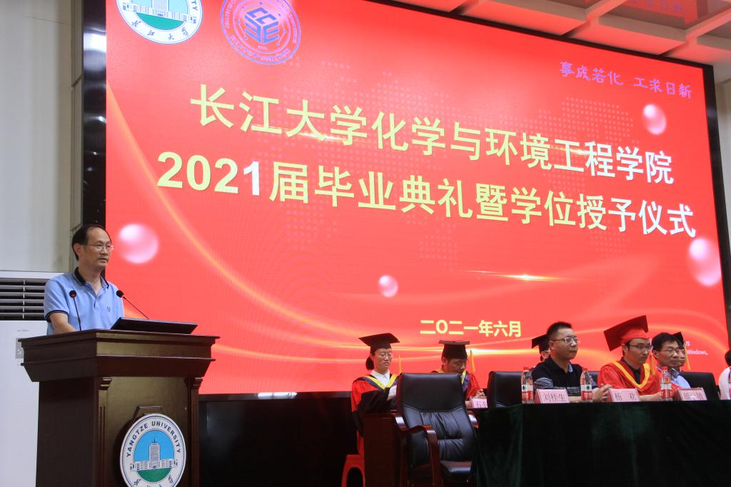 “起来,不愿做奴隶的人们”,毕业典礼在全体师生饱满热情的国歌声中拉开帷幕。随后,经理颜学敏发表致辞。颜经理说到,四年时光已然划过,他很欣慰见证了同学们最青春的成长过程,同学们也很荣幸地见证了学院的快速发展。在即将离别之际,他以“三心”之语与君共勉:希望同学们在未来的人生旅途能以本真之心入世、以赤子之心报国、以求索之心立业,母校将永远与大家同在!紧接着,教师代表尹先清教授分享了自己的所感与寄语,回首四年有苦有乐、所幸皆有所得,愿未来大家可以前途似锦,再创辉煌。优秀毕业生代化工11702班表裴欣雅通过自身经历,讲述了一名化工学子的 “长大”故事,她感谢母校的培养,丰富的教学资源给了她无限的自信,她号召2021届毕业生砥砺奋斗,握紧历史接力棒,跑出属于我们这一代的光荣和担当。随后,党委书记刘桂生作总结发言,他罗列了2021届毕业生取得的累累硕果以及学院近年来的重大科研、教学成果突破,鼓励大家继续不懈奋斗,欢迎同学们常回家看看。