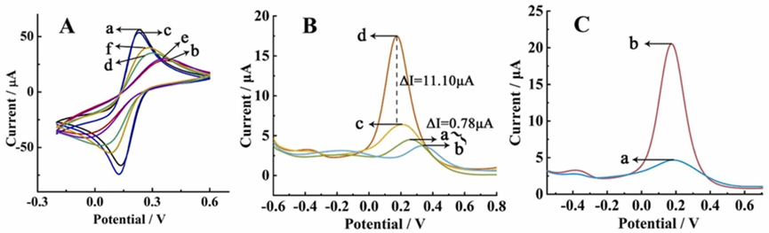 图4. (A) 电极修饰过程的CV表征 (B) (C) 可行性研究