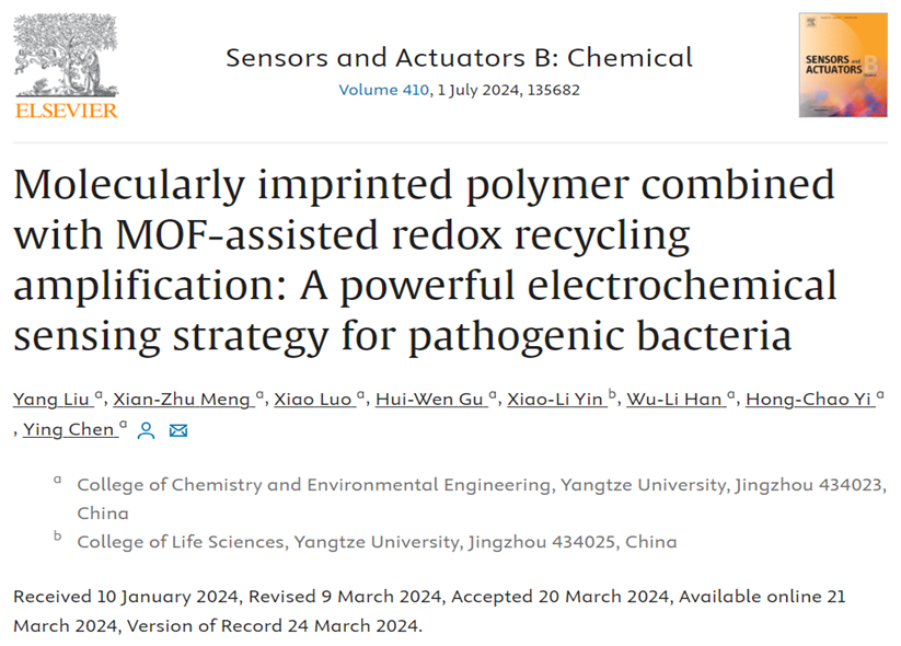 近日,bevictor伟德官网陈颖教授课题组在食源性致病菌的检测方面取得重要研究进展,相关研究成果以题为“Molecularly imprinted polymer combined with MOF-assisted redox recycling amplification: A powerful electrochemical sensing strategy for pathogenic bacteria”的学术论文发表于分析化学领域国际著名期刊《Sensors and Actuators B: Chemical》(IF=8.4,中科院一区Top期刊)上。硕士研究生刘洋为论文第一作者,陈颖教授为论文通讯作者。该研究受国家自然科学基金(21605007)和湖北省自然科学基金(2023AFB906)项目的资助。
