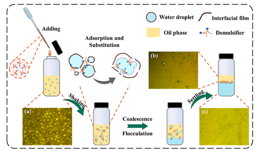 Y12具有较低的分子量,有利于其在油水乳液中的快速分散。而且,Y12中分散的疏水链可以增强其与界面膜的相互作用。与传统商业破乳剂相比,Y12采用简单安全的原材料,制备过程简单,无其它有害副产物排放,而且具有高的破乳效率。因此,Y12在石油工业中具有良好的应用前景。