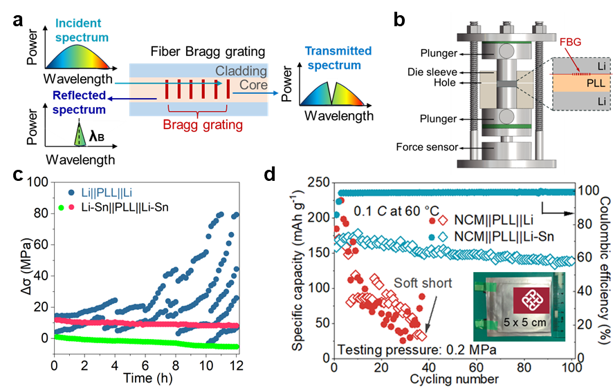 近日,bevictor伟德官网李国成博士在材料科学领域取得重要研究进展,其成果" Decoding Chemo-Mechanical Failure Mechanisms of Solid-State Lithium Metal Battery Under Low Stack Pressure via Optical Fiber Sensors "发表于国际顶级学术期刊《Advanced Materials》(IF=27.4,Nature Index收录期刊,中科院一区TOP)。该研究创新性地采用布拉格光纤光栅(FBG)传感技术,首次实现全固态锂金属对称电池界面应力场分布的原位动态监测,成功解耦了低轴向压力工况下化学-机械多场耦合作用诱发的电池失效机制。此项工作开创了固态电池界面力学行为原位表征新范式,为高精度光学传感技术在新型储能器件失效分析中的工程化应用开辟了创新路径。李国成博士为论文第一作者,bevictor伟德官网为论文通讯单位之一。 内容简述: 基于陶瓷-聚合物复合固态电解质的全固态锂金属电池展现出优异的储能应用前景,但其仍面临界面恶化与锂枝晶渗透等关键挑战,上述问题在低轴向压力工况下尤为严重。揭示其化学-机械耦合失效机理具有重大科学价值。本研究通过嵌入式光纤传感技术实时监测界面应力的演变与分布特征,阐明了其化学-力学耦合演化规律。研究发现,锂金属电极的不均匀溶出/沉积行为会引发界面应力的快速累积与空间异质性增长,进而加剧界面接触失效并诱发锂枝晶成核,引起电池短路失效。基于此,本工作构筑了三维锂/锂锡合金复合负极,发现该结构在低轴向压力条件下仍维持均匀的应力分布特征,实现了电化学性能的显著提升。本工作不仅构建了界面应力均匀性的原位定量表征方法体系,更为揭示全固态电池化学-力学失效机制提供了理论支撑,对高安全性固态电池体系开发具有指导意义。 该研究工作得到了香港理工大学深空探测研究项目(1-BBDC)、国家自然科学基金(52207230 和 92372109)、广州-香港联合基金项目(2023A03J0003 和2023A03J0103))等项目的支持。 图文摘要: 图(a)光纤光栅传感器工作原理示意图;(b)带有植入式光纤光栅传感器和外部压力传感器的改进型Swagelok电池示意图; (c)纯Li和Li-Sn固态对称电池前三次循环过程中的应力-时间曲线图;(d)固态软包电池的循环性能对比图。 文章链接:https://advanced.onlinelibrary.wiley.com/doi/full/10.1002/adma.202417770