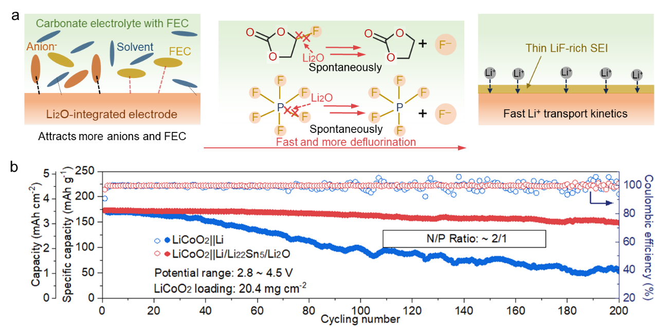 10月8日,bevictor伟德官网肖围教授课题组在高性能锂金属电池领域取得重要研究进展,其成果"Li2O-Integrated Electrodes Enabling Enhanced Adsorption/Defluorination Kinetics toward LiF-Rich Interphase for High-Performance Lithium Metal Batteries"发表于国际顶级学术期刊Advanced Functional Materials。该研究创新性地通过电极设计,集成对碳酸酯电解液中含氟组分吸附/去氟化能力强的纳米氧化物,在金属锂电极表面原位构筑了化学/电化学稳定的含氟保护层,改善了锂金属负极的电化学性能。李国成博士为论文第一作者,肖围教授为论文第一通讯作者,bevictor伟德官网为论文通讯第一单位。 内容简述: 锂金属负极因其极低的氧化还原电位和极高的理论比容量,被视为下一代高能量密度电池的理想选择。然而,其实际应用受限于较差的循环稳定性,主要归因于与碳酸酯电解液的高反应性。这种反应导致形成不稳定的固体电解质界面(SEI),在循环过程中易破裂,持续消耗活性锂和电解液。同时,天然SEI在组成、形貌和离子导率上的不均匀性会引发锂离子通量分布不均和成核位点杂乱,进而导致枝晶生长和电池短路。构建稳定均一的SEI层成为抑制副反应和枝晶问题的关键。研究发现,富含LiF等无机成分的SEI可有效提升界面稳定性。现有策略(如高浓度电解液、添加剂和表面修饰)主要通过调控电解液组成或界面化学来促进含氟物种分解生成LiF,但往往依赖复杂配方或精密工艺。相比之下,从电极设计入手,开发能高效吸附并促进含氟组分去氟化的新方法,为构建稳定富LiF界面提供了更具潜力的替代路径。 本研究提出了一种通过调控复合电极对含氟电解质组分的吸附与去氟化动力学,以定向构筑富LiF界面的新策略。采用机械化学方法,在Li/Li22Sn5复合电极中实现了Li2O纳米颗粒的原位、均匀嵌入。研究表明,Li2O对PF6⁻和氟代碳酸亚乙酯(FEC)具有强吸附能力,可加速其自发去氟化过程,进而引导形成以阴离子/FEC衍生物为主的富LiF 固体电解质界面。结合光谱学表征与理论计算,证实了Li22Sn5表面对含氟物种具有优先吸附与去氟化促进作用具有优先吸附与去氟化促进作用,揭示了该界面结构的形成机制。同时,稳定的Li22Sn5合金骨架有助于引导均匀锂沉积并缓冲体积变化,与Li2O协同增强电极稳定性。该复合负极在碳酸酯电解液中实现50次循环内平均库仑效率99.0%。与LiCoO2正极组装的完整电池在苛刻条件(N/P = 2:1,贫电解液20 μL)下表现出优异的循环稳定性,面容量为3.3 mAh cm⁻2,200周后容量保持率达87.0%;180 mAh软包电池在100次循环后仍保持78.2%的容量,充分证明了该电极设计策略的实际应用潜力。 该研究工作得到了国家自然科学基金(52272207和52274292)、北京自然科学基金(2192029)、湖北省杰出青年基金(2020CFA090)等项目的支持。 图文摘要: 图(a)Li/Li22Sn5/Li2O电极吸附/去氟化构筑富含LiF固态电解质界面层示意图;(b)LiCoO2||Li/Li22Sn5/Li2O、LiCoO2||Li电池循环性能对比图。 文章链接:https://advanced.onlinelibrary.wiley.com/doi/epdf/10.1002/adfm.202523194 (审核:肖围 编辑:常艳玲)